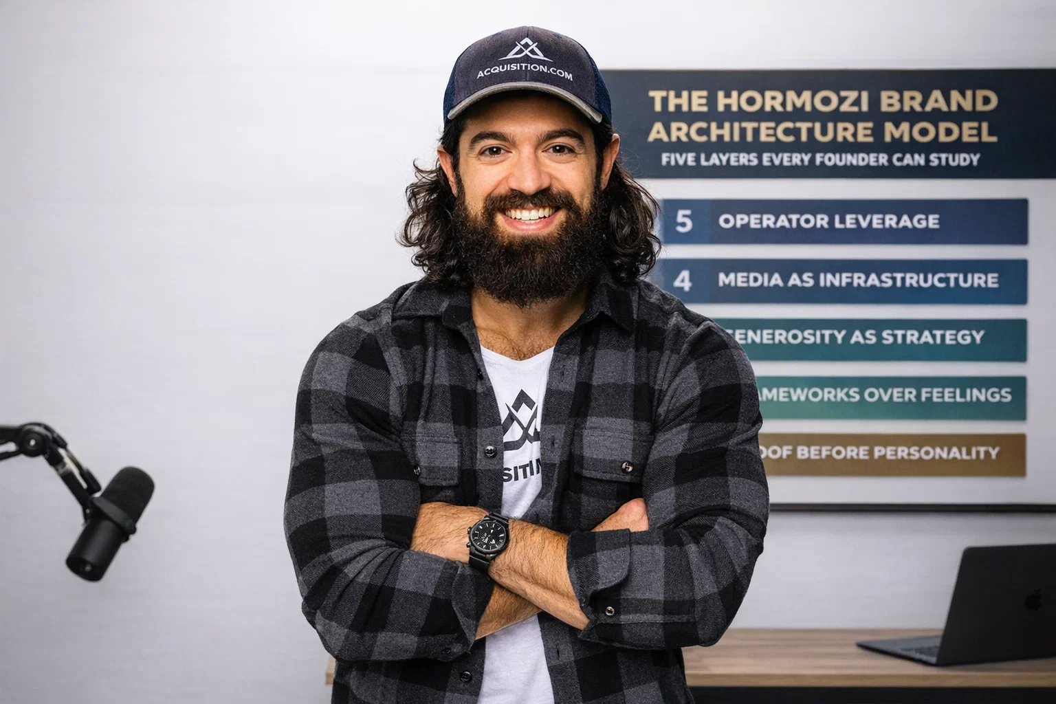 The Hormozi Brand Architecture Model has five layers: Proof Before Personality, Frameworks Over Feelings, Generosity as Strategy, Media as Infrastructure, and Operator Leverage