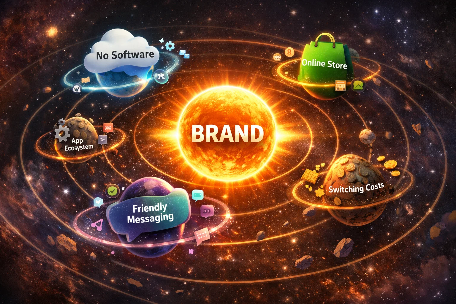 Every new touchpoint reinforces the brand → deepens other moats → makes the brand stronger