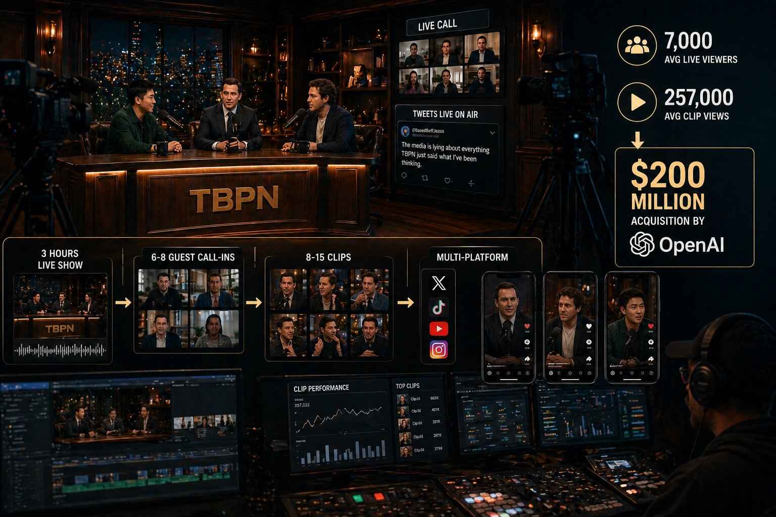 TBPN runs three hours of live show, five days a week, with around 7,000 average live viewers. Their average clip pulls 257,000 views. The show sold to OpenAI for $200 million because the format was engineered for clippability from the start.