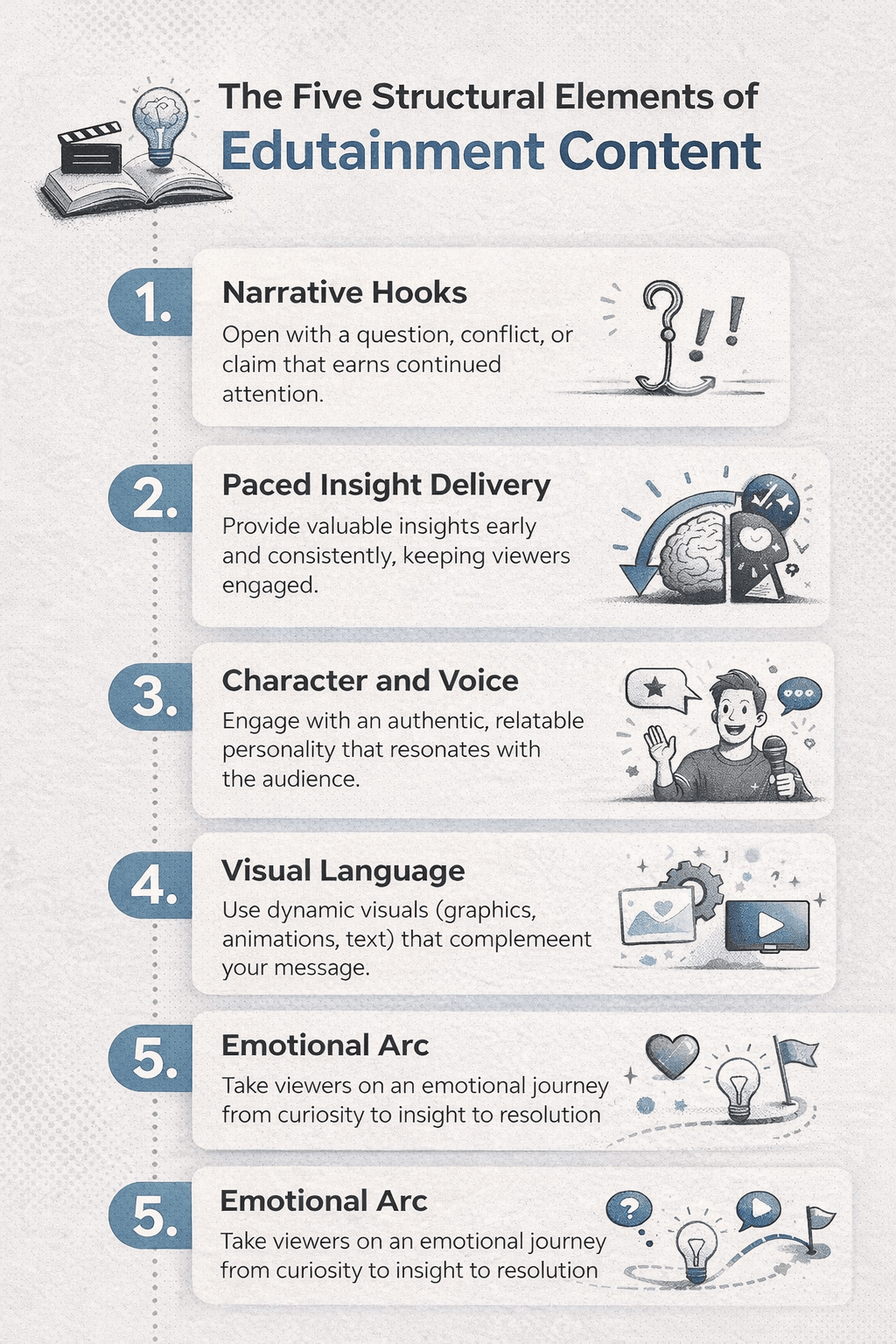 Edutainment follows a five-part architecture: narrative hooks, paced insight delivery, character and voice, visual language, and emotional arc