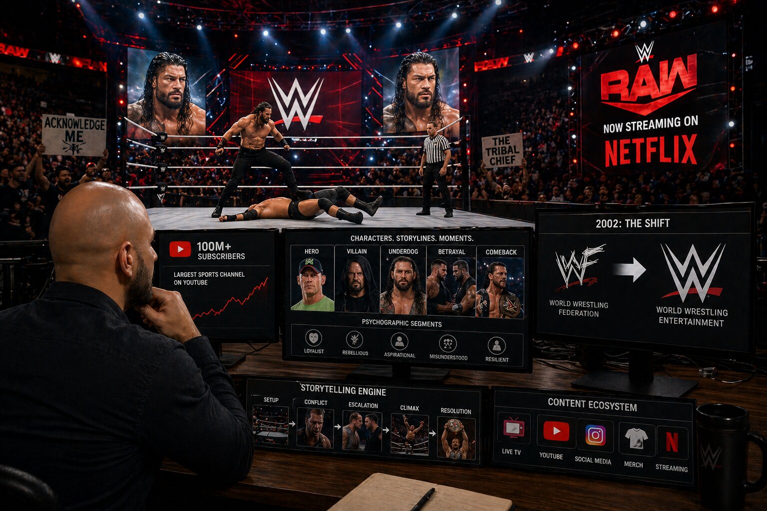The contrarian point most marketing teams miss is this. The thing wrestling skeptics dismiss as "fake" is what makes WWE a masterclass in brand-building. Every heel turn is scheduled. Every betrayal is plotted. Every underdog comeback maps to a specific psychographic segment. That is not chaos. That is content strategy.