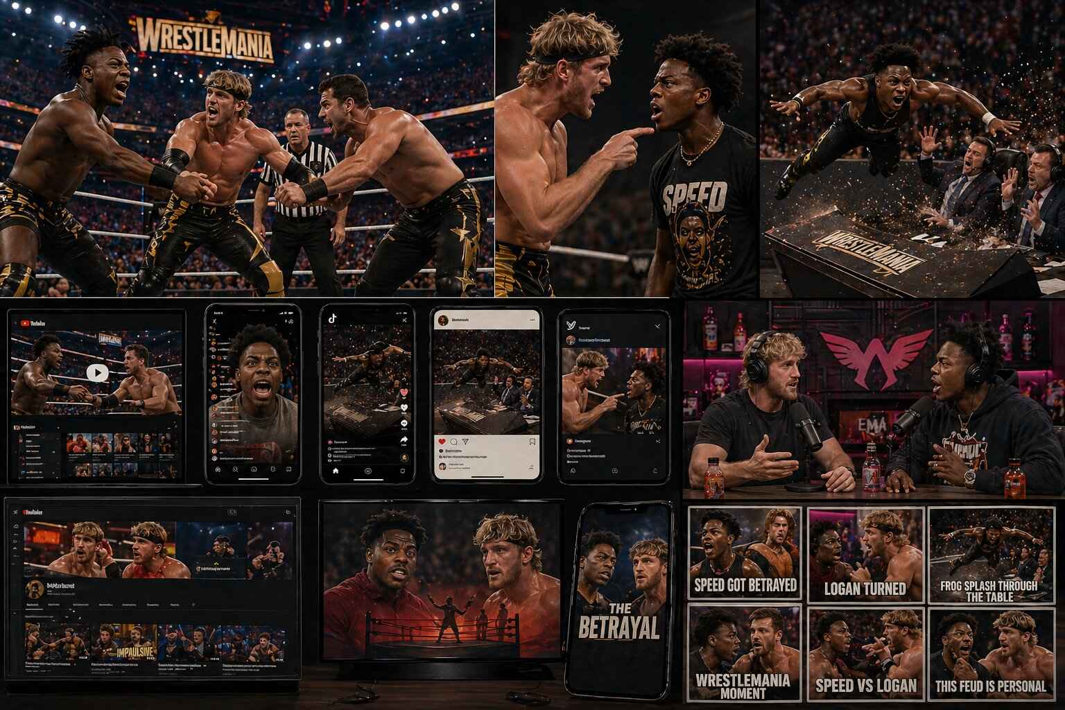 iShowSpeed appeared with Logan Paul in a six-man tag match. Their team lost. Logan blamed Speed and turned on him on live television. Speed answered with a frog splash through the announcer's table. Clips traveled across every social platform within hours.